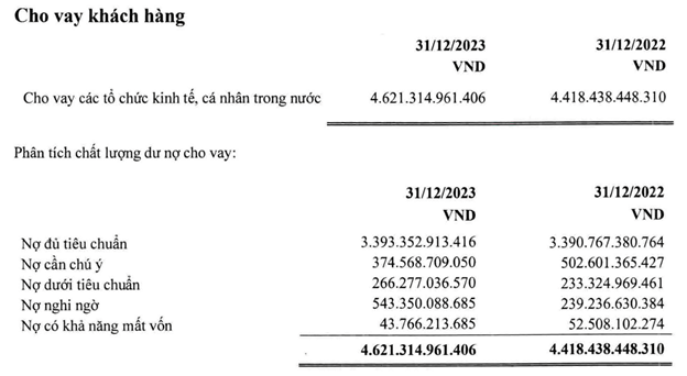 Đến cuối năm 2023, tổng tài sản của VietCredit ở mức 6.852 tỷ đồng, tăng gần 4,8% so với đầu năm. Trong đó, cho vay khách hàng chiếm đến 67% với số dư cuối kỳ đạt 4.621 tỷ đồng, tăng 4,6% so với đầu năm. Tuy nhiên, chất lượng tín dụng của công ty tài chính này đã đi xuống rõ rệt.