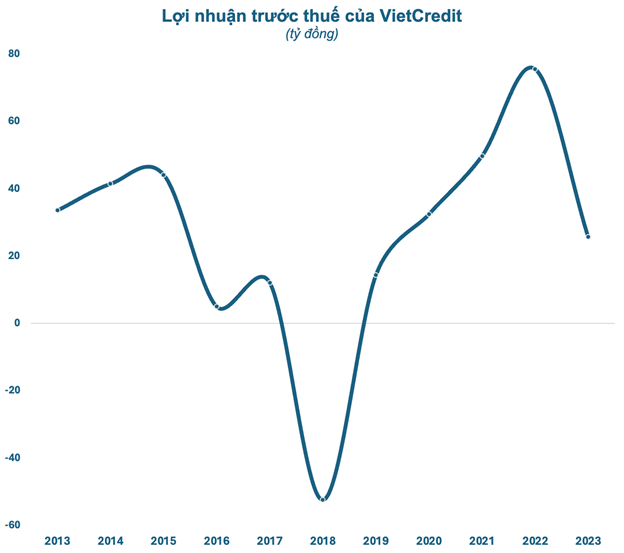 Lợi nhuận trước thuế năm 2023 của VietCredit chỉ đạt 25,7 tỷ đồng, giảm đến 66% so với năm 2022 và là mức lợi nhuận thấp nhất trong vòng 4 năm trở lại đây của VietCredit.