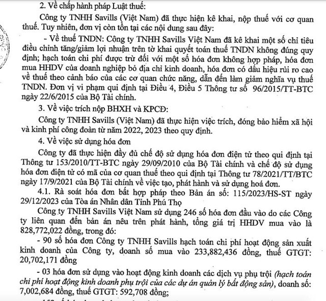 Cục Thuế TP. Hà Nội vừa công bố kết luận thanh tra thuế tại Công ty TNHH Savills (Việt Nam). Theo đó, Savills Việt Nam đã thực hiện kê khai, nộp thuế với cơ quan thuế nhưng còn tồn tại một số nội dung như sau: