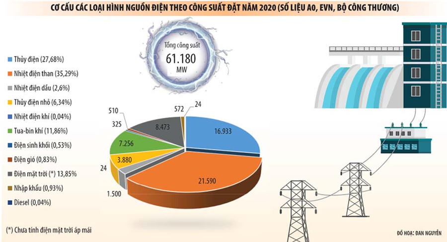 Thống kê của Bộ Công thương trong năm 2020 có khoảng 8.473 MW điện mặt trời quy mô lớn được lắp đặt. Tuy nhiên, con số này chưa tính tới khoảng 5.300 MWp (tương đương khoảng 4.400 MW) điện mặt trời áp mái cũng đã được lắp đặt và hòa lưới tới thời điểm sáng ngày 28/12/2020.