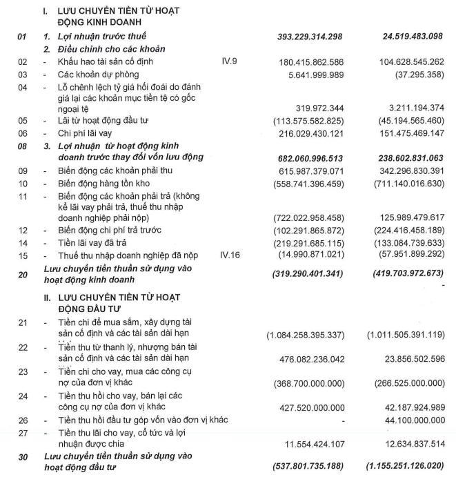 Ngoài ra, cũng trong kỳ, dòng tiền hoạt động đầu tư âm 537,8 tỷ đồng và dòng tiền tài chính dương 923,05 tỷ đồng, chủ yếu phát hành thêm cổ phiếu và tăng vay nợ để bù đắp thâm hụt dòng tiền kinh doanh.