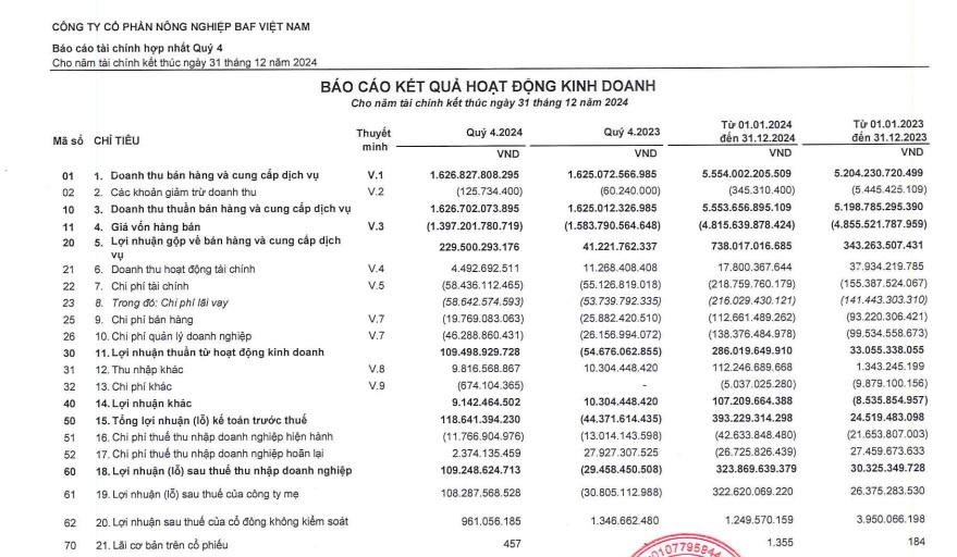 Theo đó, trong quý cuối năm 2024, BAF ghi nhận doanh thu thuần đạt 1.626,7 tỷ đồng, tăng nhẹ 0,1% so với cùng kỳ.