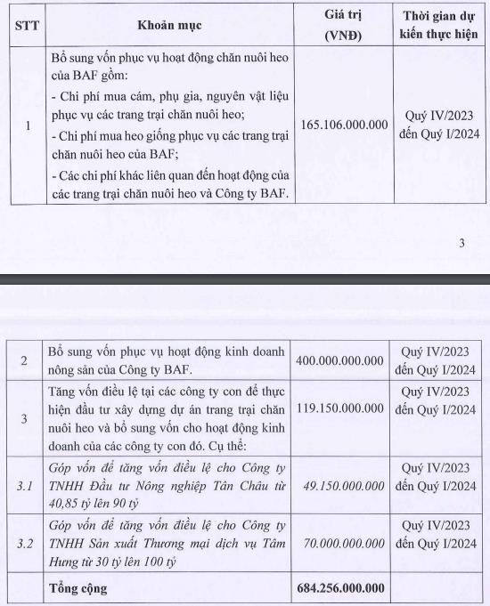 Phần còn lại 119,15 tỷ đồng, BAF dự kiến dùng để tăng vốn điều lệ tại các công ty con để thực hiện đầu tư xây dựng dự án trang trại chăn nuôi heo và bổ sung vốn cho hoạt động của các công ty con. Thời gian giải ngân dự kiến từ quý IV/2023 đến quý I/2024.