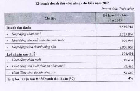 Trong đó, mảng chăn nuôi dự kiến mang về 2.526 tỷ đồng doanh thu và 192 tỷ đồng lợi nhuận; mảng thức ăn chăn nuôi có kế hoạch doanh thu 1.000 tỷ đồng và hơn 45 tỷ đồng lợi nhuận; mảng nông sản dự kiến có doanh thu 4.000 tỷ đồng và lợi nhuận 64 tỷ đồng.