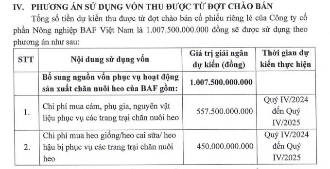 Tổng số tiền huy động được dự kiến là 1.007,5 tỷ đồng. Với số tiền này, công ty dự kiến dùng 557,5 tỷ đồng để bổ sung nguồn vốn phục vụ hoạt động sản xuất chăn nuôi heo gồm chi phí mua cám, phụ gia, nguyên vật liệu phục vụ các trang trại chăn nuôi heo. Số tiền 450 tỷ đồng còn lại dùng để bổ sung chi phí mua heo giống/heo cai sữa/heo hậu bị phục vụ các trang trại chăn nuôi.