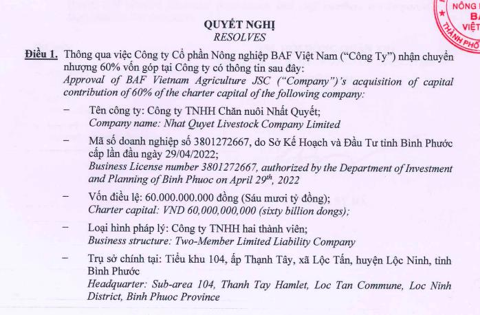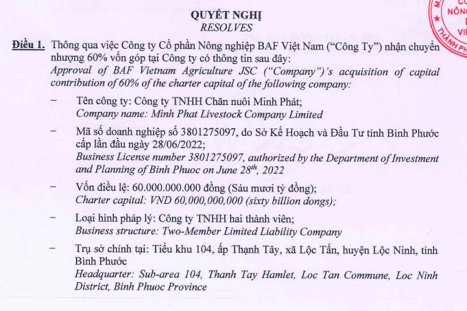 Công ty cổ phần Nông nghiệp BAF Việt Nam (mã ck: BAF) thông báo quyết nghị về việc nhận chuyển nhượng nhận chuyển nhượng 60% vốn điều lệ tại Công ty TNHH Chăn nuôi Minh Phát và 60% vốn tại Công ty TNHH Chăn nuôi Nhất Quyết.