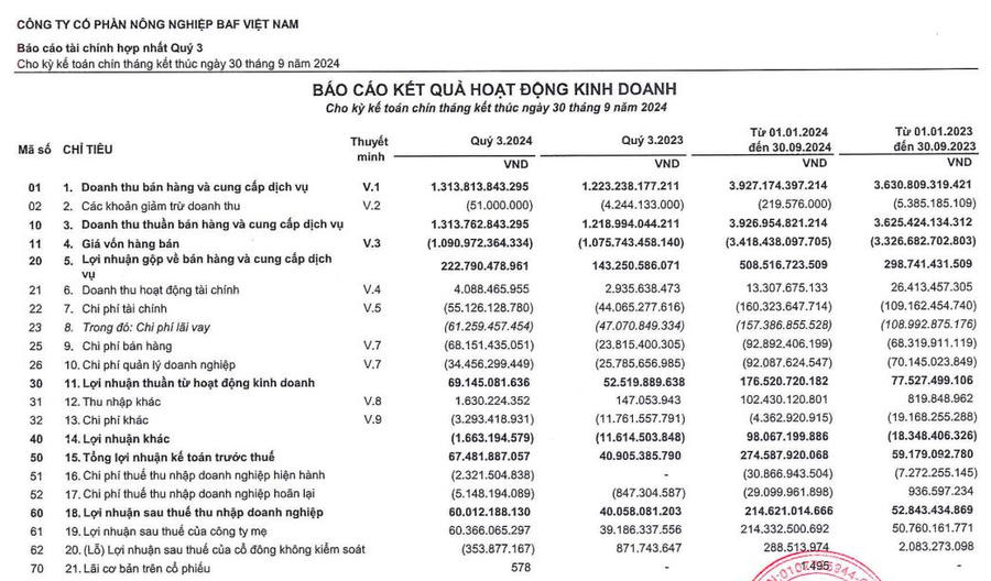 Các thương vụ M&A diễn ra trong bối cảnh tình hình kinh doanh của BAF cải thiện mạnh mẽ. Theo báo cáo tài chính hợp nhất quý III/2024, BAF ghi nhận doanh thu thuần đạt 1.313 tỷ đồng, tăng 7,79% so với cùng kỳ năm ngoái nhờ kiểm soát tốt chi phí và giá nguyên liệu đầu vào giảm từ 10 - 20%.