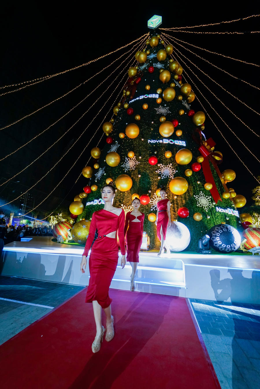 Các màn trình diễn thời trang cũng là điểm nhấn trong chuỗi sự kiện. Các người mẫu xin đẹp catwalk trên thảm đỏ nối dài từ sân khấu lớn, vòng quanh cây thông Noel khổng lồ được trang trí lung linh. Chuỗi sự kiện âm nhạc, thời trang mừng Giáng sinh và năm mới diễn ra từ ngày 10/12 đến hết 2/1/2022 tại Novaland Gallery, Quận 1, TP.HCM.