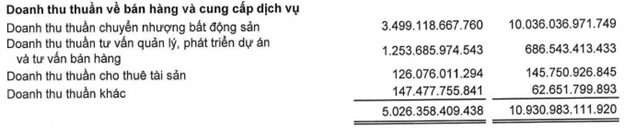 Tính chung cả năm 2020, Novaland ghi nhận 5.026 tỷ đồng doanh thu thuần. Trong đó, hoạt động chuyển nhượng bất động sản vẫn chiếm tỷ trọng lớn nhất với gần 70% đạt mức 3.499 tỷ đồng, giảm giảm hơn 65% so với 2019. Ngược lại, doanh thu thuần tư vấn quản lý, phát triển dự án và tư vấn bán hàng lại tăng gần gấp đôi lên mức 1.254 tỷ đồng.