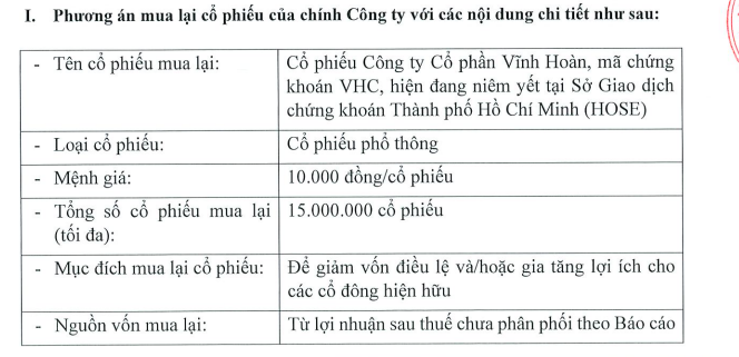 Công ty cổ phần Vĩnh Hoàn (mã ck: VHC) mới công bố tài liệu lấy ý kiến cổ đông bằng văn bản về việc phương án mua lại cổ phiếu VHC của chính công ty.