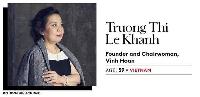 Bà Trương Thị Lệ Khanh cũng là một trong 2 đại diện của Việt Nam lọt bảng vàng 25 nữ doanh nhân quyền lực nhất châu Á 2020 (Asia's Power Businesswomen) của tạp chí Forbes.