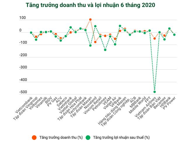 Kết quả cũng cho thấy chỉ có 10/30 báo doanh thu cao hơn so với cùng kỳ và có 11/30 công ty báo lợi nhuận tăng. Trong các công ty bị sụt giảm mạnh doanh thu và lợi nhuận thì hai khoản lỗ lớn của hãng hàng không quốc gia Vietnam Airlines (-6.640 tỷ đồng) và Petrolimex (-1.080 tỷ đồng).