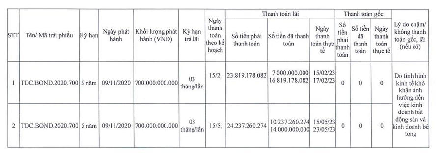 Trong đó, đối với mã trái phiếu TDC.BOND.2020.700, công ty đã 2 lần liên tiếp không trả được lãi trái phiếu đáo hạn.