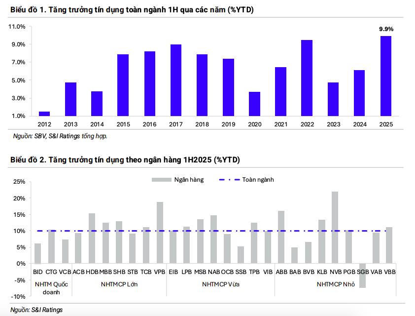 Trong nửa đầu năm 2025, tín dụng toàn hệ thống ngân hàng đạt mức tăng trưởng 9,9% so với đầu năm, theo phân tích của S&I Ratings, đây là con số cao nhất kể từ năm 2012. Động lực tăng trưởng chủ yếu đến từ khối ngân hàng thương mại cổ phần, đặc biệt là các ngân hàng tập trung cho vay doanh nghiệp. Ngược lại, khối quốc doanh và một số ngân hàng bán lẻ chỉ duy trì tốc độ khiêm tốn trong khoảng 6 - 9%. Sự phân hóa này phản ánh rõ nét sự khác biệt trong chiến lược hoạt động cũng như khẩu vị rủi ro của từng nhóm ngân hàng.