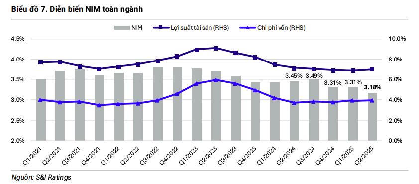 Bên cạnh đó, biên lãi ròng (NIM) cũng tiếp tục thu hẹp, xuống mức 3,18% trong quý II, thấp nhất kể từ năm 2018. Nguyên nhân chính xuất phát từ việc lãi suất cho vay giảm 60 điểm cơ bản so với cuối 2024, theo định hướng hỗ trợ tăng trưởng kinh tế, trong khi chi phí vốn lại tăng thêm 25 điểm cơ bản do các ngân hàng phải đẩy mạnh huy động kỳ hạn dài.