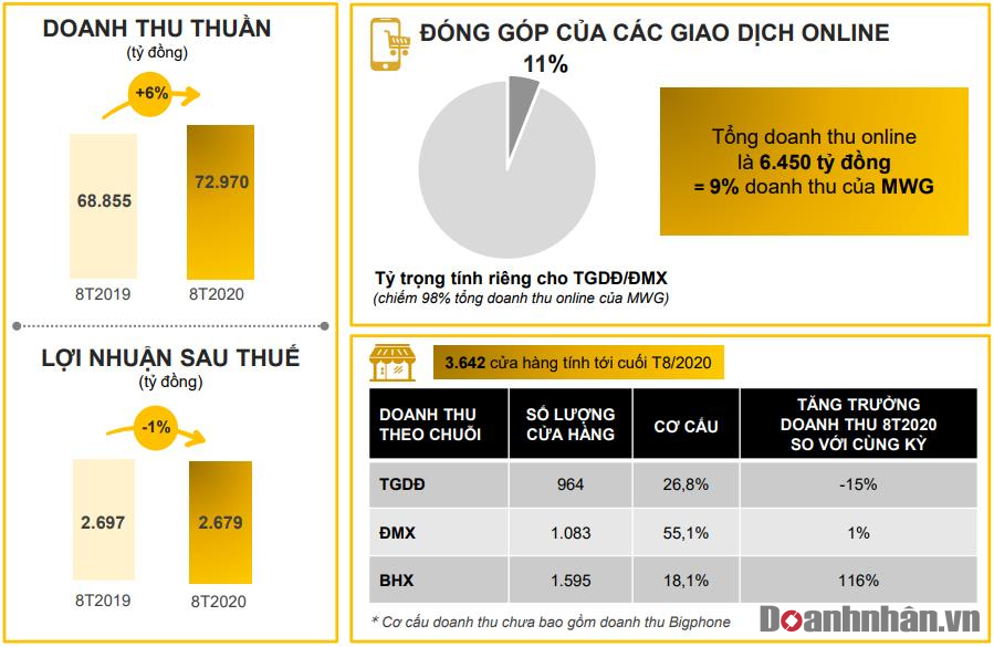 Mới đây, MWG đã công bố tình hình kinh doanh 8 tháng đầu năm với doanh thu thuần hợp nhất gần 73.000 tỷ đồng, lợi nhuận sau thuế đạt 2.679 tỷ đồng, tương ứng tăng 6% và giảm 1% so với cùng kỳ năm 2019. Với kết quả đạt được, MWG hoàn thành 66% kế hoạch doanh thu và 78% kế hoạch lợi nhuận sau thuế cả năm.