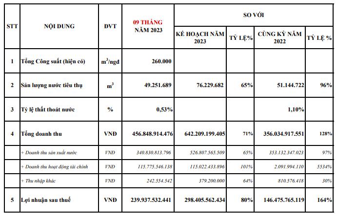 Tính riêng trong quý III/2023, doanh thu sản xuất nước ước đạt 107 tỷ đồng, giảm 13% so với cùng kỳ năm trước; lợi nhuận sau thuế ước đạt 56 tỷ đồng, tăng nhẹ gần 3% so với cùng kỳ 2022.