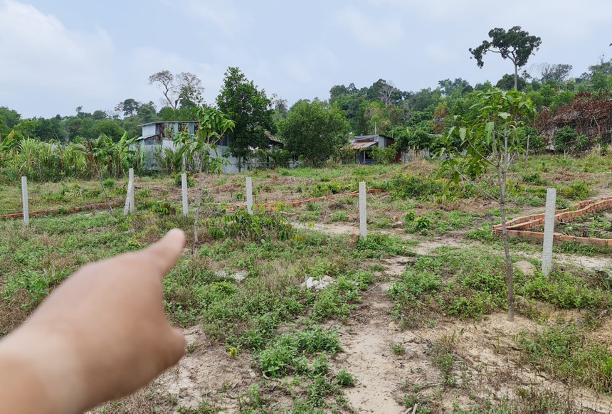 Phóng viên Zing theo chân ông Nhơn đến ấp Xóm Mới của xã Bãi Thơm, TP Phú Quốc vào giữa tháng 3. Thấy có người dừng ôtô cuối con đường đất đỏ, 2 phụ nữ và một người đàn ông lân la bắt chuyện rồi mời mua đất không có giấy tờ chứng minh nguồn gốc.