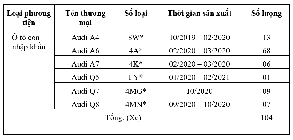 Theo tài liệu do công ty cung cấp, Cục CT&BVNTD thông báo chương trình thu hồi để thay thế các đai ốc liên kết của hệ thống treo trục sau trên xe Audi model 2019 đến 2021 do Công ty TNHH Ô tô Á Châu nhập khẩu và phân phối. Tổng số, có 104 xe với các thông tin cụ thể về sản phẩm như sau: