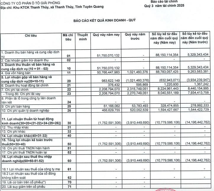CTCP Ô tô Giải Phóng (mã ck: GGG) vừa công bố tình hình kinh doanh quý III/2025.
