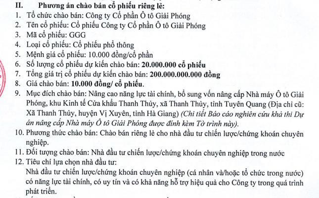 Cũng tại ĐHĐCĐ bất thường, GGG thông qua phương án chào bán riêng lẻ 20 triệu cp, với giá 10.000 đồng/cp. Đối tượng chào bán là nhà đầu tư chiến lược và nhà đầu tư chứng khoán chuyên nghiệp.