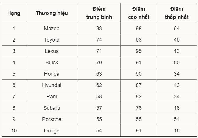 Khảo sát, thực hiện với xe đời 2000-2020, dựa trên dữ liệu thu thập từ các thành viên và người đặt mua tạp chí tiêu dùng nổi tiếng của Mỹ Consumer Reports về trải nghiệm với hơn 300.000 chiếc xe. Điểm được chấm theo thang 100.
