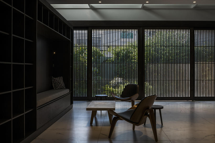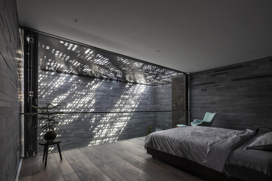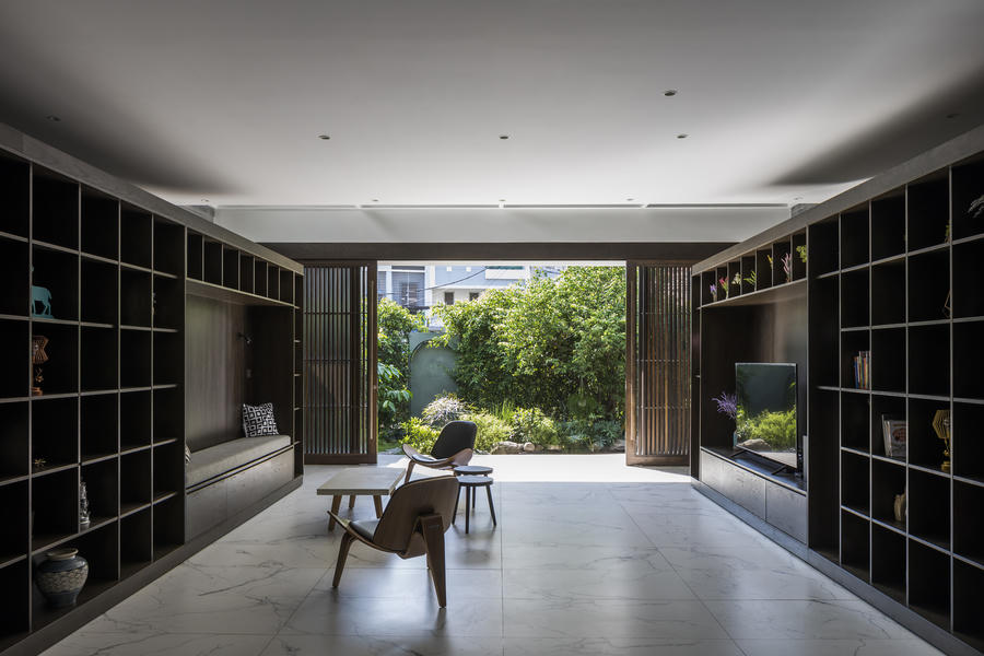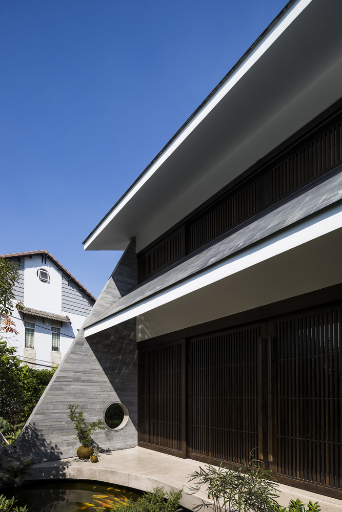 Cửa trượt lam gỗ không chỉ giúp lấy sáng mà còn tạo vẻ bí ẩn thêm cho ngôi nhà.
