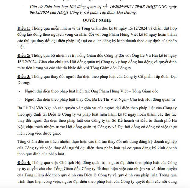 Ngày 6/12/2024, Công ty cổ phần Tập đoàn Đại Dương (Ocean Group, mã ck: OGC) đã có văn bản gửi Sở Giao dịch Chứng khoán TP.HCM (HoSE) công bố thông tin bất thường liên quan đến vấn đề nhân sự.