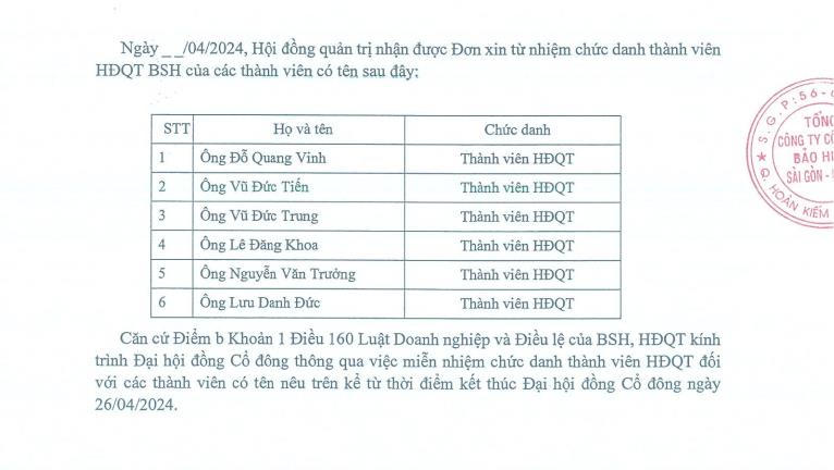 HĐQT Tổng Công ty CP Bảo hiểm Sài Gòn - Hà Nội (BSH, Mã: BHI) ngày 16/4 thông báo đã nhận đơn từ nhiệm vị trí thành viên HĐQT của 6 người. Lý do đưa ra trong các đơn từ nhiệm đều là do công việc cá nhân. Thời điểm xin từ nhiệm là kể từ ngày 15/4/2024.