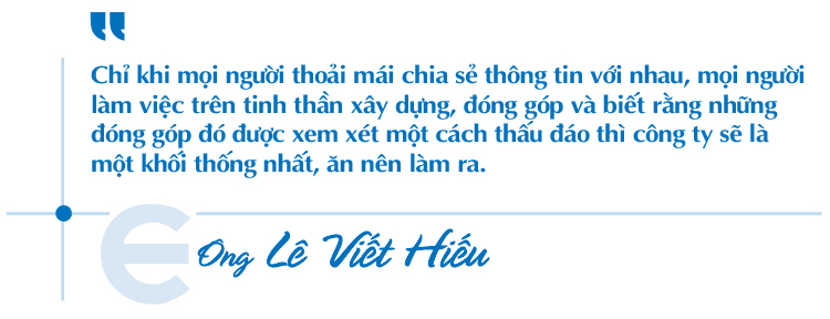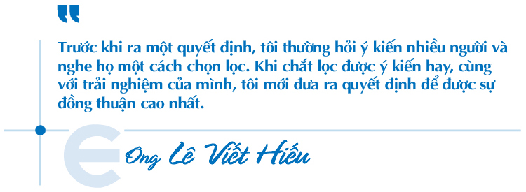 - Thời gian đầu không tránh khỏi có người nghi ngờ khả năng của một CEO mới. Nhưng chỉ chưa đầy hai tháng sau thì họ đã biết cách tôi điều hành doanh nghiệp. Trước khi ra một quyết định, tôi thường hỏi ý kiến nhiều người và nghe họ một cách chọn lọc. Khi chắt lọc được ý kiến hay, cùng với trải nghiệm của mình, tôi mới đưa ra quyết định để được sự đồng thuận cao nhất. Mọi người đều ủng hộ cách điều hành đó.