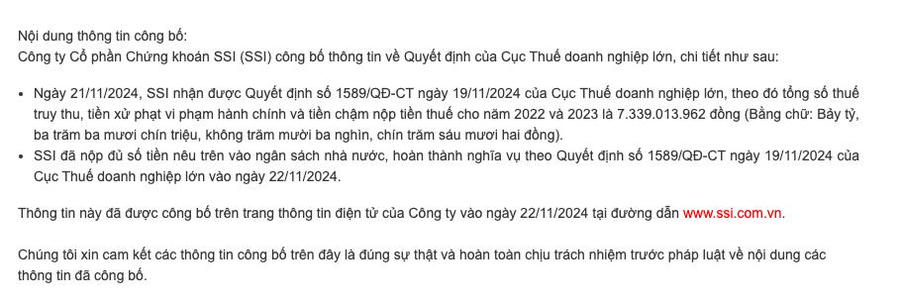 Theo văn bản nêu rõ, ngày 21/11, Công ty cổ phần Chứng khoán SSI nhận được quyết định của Cục Thuế doanh nghiệp lớn (Tổng cục Thuế). Theo đó, tổng số thuế truy thu, tiền xử phạt vi phạm hành chính và tiền chậm nộp thuế cho năm 2022 và năm 2023 là hơn 7,3 tỷ đồng.