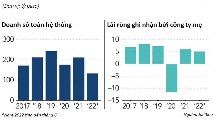 Jollibee ghi nhận doanh thu và lợi nhuận trên đà phục hồi tốt sau dịch Covid-19. Doanh thu toàn hệ thống - bao gồm tất cả các thương hiệu, cửa hàng sở hữu trực tiếp và cả cửa hàng được nhượng quyền - tăng 35,4% lên 133,1 tỷ peso (~ 2,26 tỷ USD) trong nửa đầu năm 2022. Lợi nhuận ròng tăng 351,7% lên 5,1 tỷ peso (~ 86,7 triệu USD).