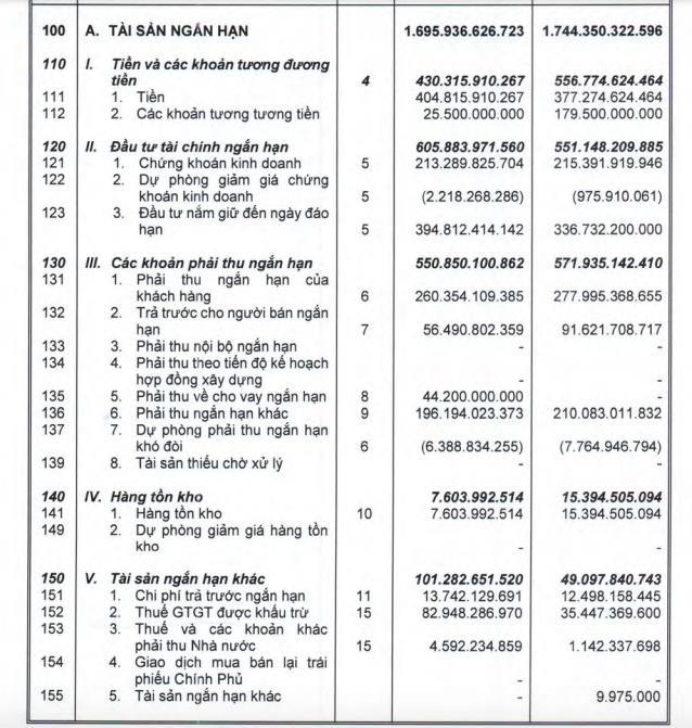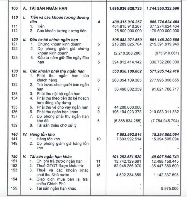 Bên cạnh đó, khoản đầu tư tài chính ngắn hạn chiếm 605,8 tỷ đồng, tăng 10% so với đầu năm. Chiếm hơn 2/3 khoản đầu tư tài chính ngắn hạn là tiền gửi có kỳ hạn với 394,8 tỷ đồng.