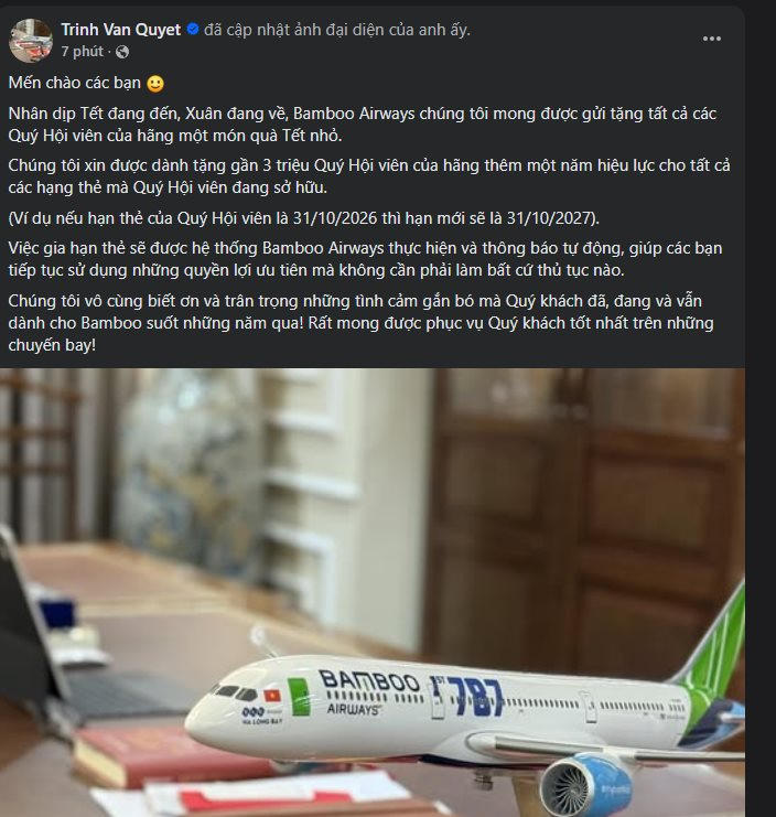 Sau thời gian vắng bóng, ông Trịnh Văn Quyết vừa có động thái đáng chú ý trên mạng xã hội khi thông báo chính sách tự động gia hạn thẻ hội viên thêm 12 tháng cho toàn bộ khách hàng của Bamboo Airways. Đây được xem là bước đi chiến lược nhằm củng cố niềm tin khách hàng trong dịp cao điểm Tết Nguyên đán.
