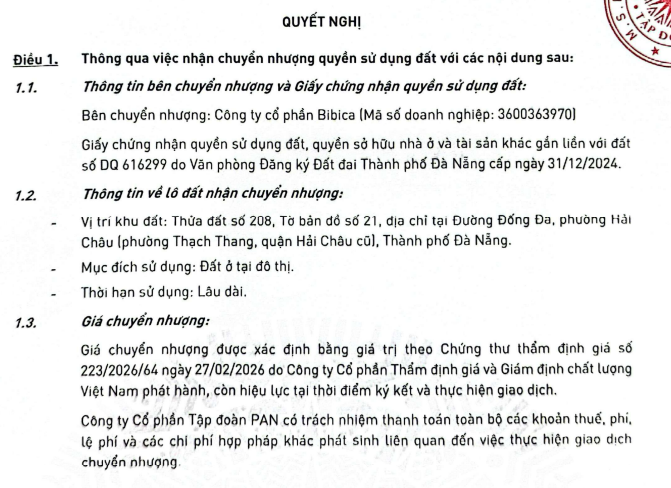 CTCP Tập đoàn PAN (PAN Group, mã ck: PAN) vừa thông qua nghị quyết về việc nhận chuyển nhượng thửa đất số 208, tờ bản đồ số 21, địa chỉ tại đường Đống Đa, phường Hải Châu, TP. Đà Nẵng (trước đây là phường Thạch Thang, quận Hải Châu). Mục đích sử dụng của thửa đất là đất ở tại đô thị, với thời hạn sử dụng lâu dài.
