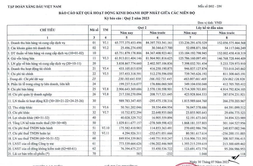 Luỹ kế 6 tháng đầu năm, doanh thu thuần Petrolimex đạt 133.184 tỷ đồng, giảm 12% so với cùng kỳ. Lợi nhuận sau thuế đạt 1.516,9 tỷ đồng, gấp 4,9 lần so với nửa đầu năm 2022.