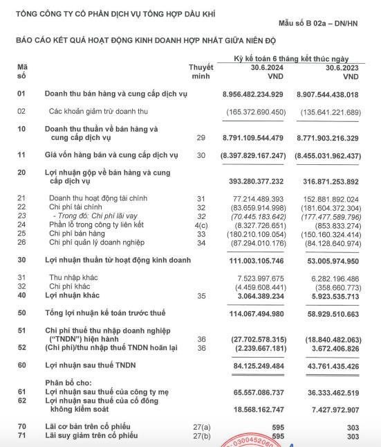 Năm 2024, Petrosetco đặt kế hoạch doanh thu 18.540 tỷ đồng, tăng 8% so với cùng kỳ, lợi nhuận sau thuế dự kiến 205 tỷ đồng, tăng 47% so với thực hiện trong năm 2023. Như vậy, kết thúc nửa đầu năm Petrosetco hoàn thành khoảng 41% so với kế hoạch năm 2024.
