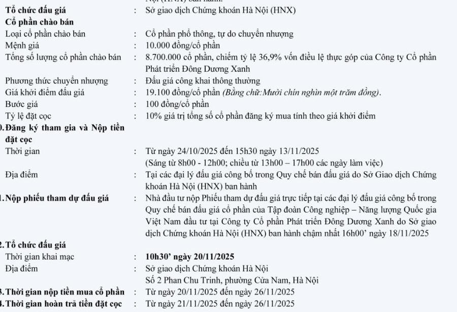 Thời gian đăng ký tham gia và nộp tiền đặt cọc từ ngày 24/10/2025 đến 15h30 ngày 13/11/2025, tỷ lệ đặt cọc là 10% giá trị tổng số cổ phần đăng ký mua tính theo giá khởi điểm.
