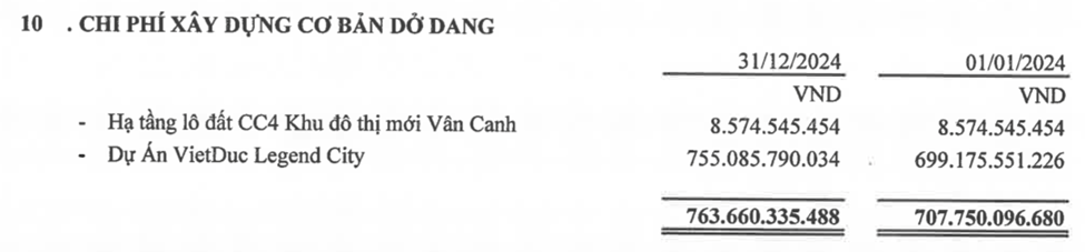 Thời điểm 31/12/2024, tổng tài sản của VGS ở mức hơn 2.300 tỷ đồng, giảm nhẹ so với đầu năm. Như vậy, riêng khoản chi phí xây dựng cơ bản dở dang nằm tại dự án Khu đô thị Việt Đức Legend City đã chiếm đến gần 1/3 tổng tài sản của doanh nghiệp này. Về nguồn vốn, nợ phải trả của VGS tính đến cuối năm 2024 ở mức 1.250 tỷ trong khi vốn chủ sở hữu gần 1.100 tỷ đồng.