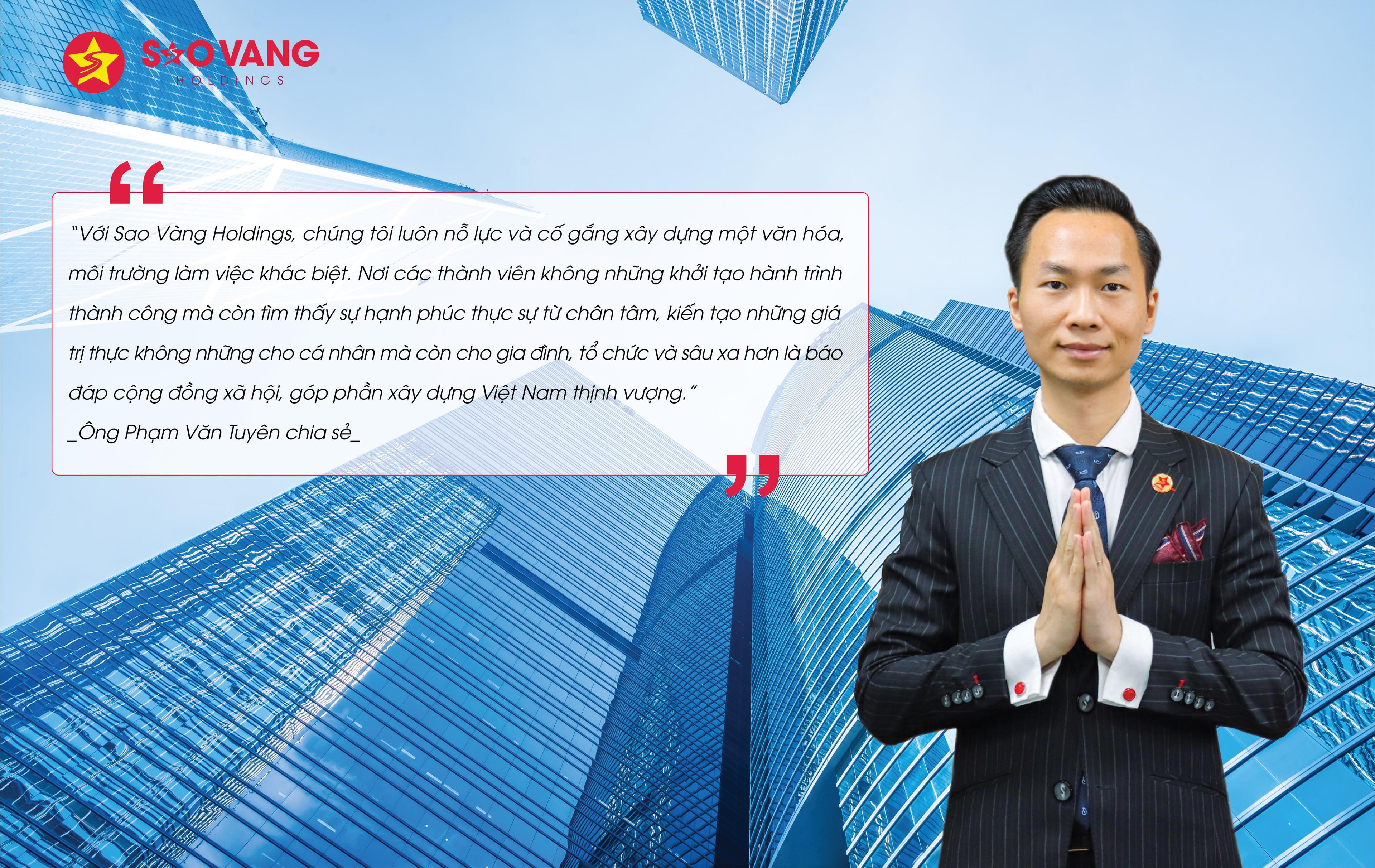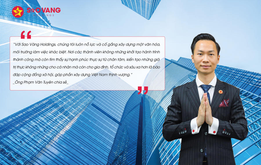 “Đạt được những thành công bước đầu này là do công ty may mắn có được những lãnh đạo chung chí hướng, có năng lực và tinh thần phụng sự hết mình vì tập thể. Hiện nay, Sao Vàng Holdings có khoảng 80 nhân sự cấp quản lý và lãnh đạo, đây đều là những thành viên nòng cốt tuyệt vời của doanh nghiệp, là nền tảng để tiếp tục đưa doanh nghiệp lên những bước phát triển mạnh mẽ và vững chắc. Công ty luôn biết ơn những người lãnh đạo tuyệt vời này” - ông Phạm Văn Tuyên - Chủ tịch HĐQT Sao Vàng Holdings chia sẻ.