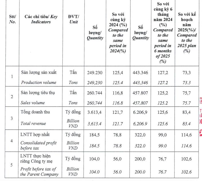 Theo đó, doanh thu quý II/2025 của BFC đạt hơn 3.613 tỷ đồng, tăng 22% so với cùng kỳ. Lãi trước thuế hợp nhất quý II ước đạt 184,5 tỷ đồng, giảm 21% so với cùng kỳ.