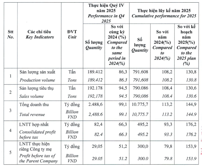 Lũy kế cả năm 2025, sản lượng sản xuất và tiêu thụ của BFC đều vượt hơn 8% so với năm trước, đạt gần 792 tỷ đồng và hơn 790 tỷ đồng.