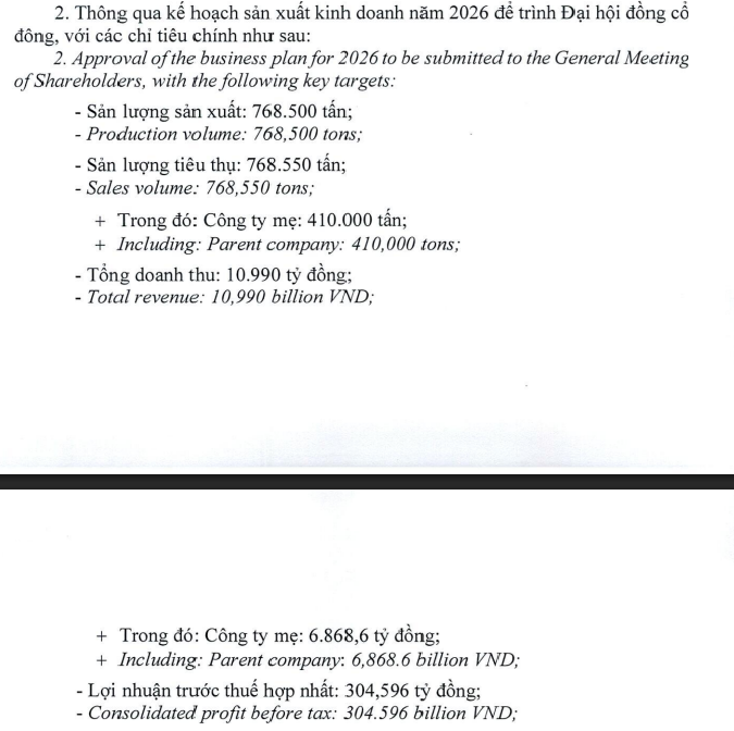 Tính riêng quý I/2026, BFC thông qua kế hoạch tổng doanh thu và lãi trước thuế hợp nhất lần lượt là 2.300 tỷ đồng và 75 tỷ đồng, giảm 11% và 45% so với cùng kỳ. Tổng sản lượng sản xuất là 155.000 tấn và sản lượng tiêu thụ là 160.000 tấn.