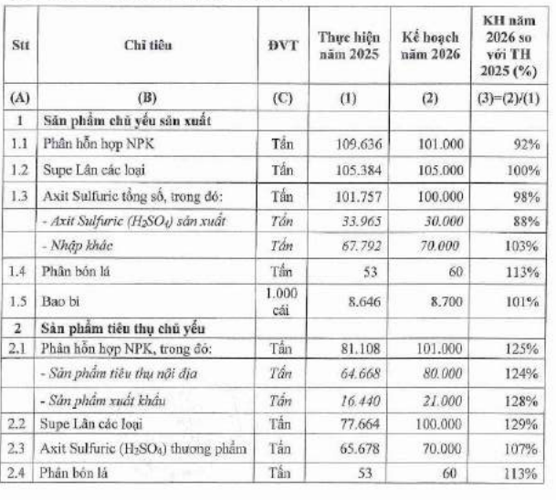 Đối với mặt hàng Supe Lân các loại, kế hoạch sản xuất được giữ ở mức 105.000 tấn, tương đương năm 2025, nhưng mục tiêu tiêu thụ dự kiến tăng 29%, đạt 100.000 tấn.