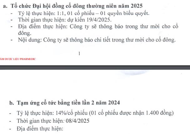 Công ty cổ phần Dược phẩm Dược liệu Pharmedic (mã ck: PMC) vừa thông báo, ngày 24/03 tới đây sẽ là ngày chốt danh sách cổ đông tạm ứng cổ tức lần 2 năm 2024 và tham dự Đại hội đồng cổ đông năm 2025.