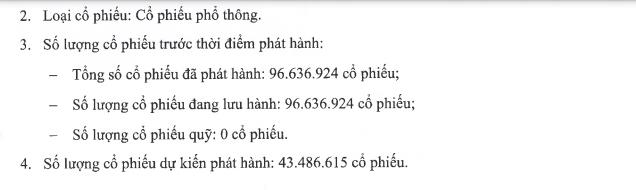 Tỷ lệ thực hiện quyền là 100:45, tức cổ đông sở hữu 1 cổ phiếu sẽ được nhận 45 cổ phiếu mới. Tổng giá trị phát hành tính theo mệnh giá là gần 434,9 tỷ đồng.