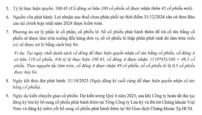 Nguồn vốn được lấy từ lợi nhuận sau thuế chưa phân phối tại thời điểm 31/12/2024 căn cứ theo báo cáo tài chính riêng năm 2024 được kiểm toán. Thời điểm dự kiến chuyển giao cổ phiếu là trong quý IV/2025, sau khi công ty hoàn tất thủ tục theo quy định.