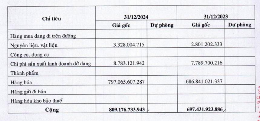 Hàng tồn kho tăng từ 697,4 tỷ đồng lên mức 809,1 tỷ đồng, chủ yếu do nguyên liệu, chi phí sản xuất kinh doanh dở dang và hàng hóa tăng cao hơn so với cuối năm ngoái.