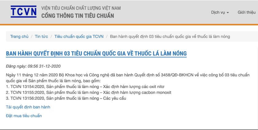 Về mặt kỹ thuật, ông Lê Thành Hưng, Trưởng phòng Tiêu chuẩn chất lượng công nghiệp thực phẩm, Viện Tiêu chuẩn chất lượng Việt Nam (VSQI), Ủy ban Tiêu chuẩn, Đo lường, Chất lượng quốc gia, Bộ Khoa học và Công nghệ cho biết, từ năm 2020, cơ quan này đã nghiên cứu và công bố 3 tiêu chuẩn quốc gia đối với thuốc lá nung nóng (TLNN).