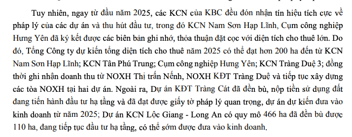KBC dự kiến tổng diện tích cho thuê năm 2025 có thể đạt hơn 200ha, đến từ KCN Nam Sơn Hạp Lĩnh, KCN Tân Phú Trung, cụm công nghiệp Hưng Yên, KCN Tràng Duệ 3. Đồng thời, ghi nhận doanh thu từ nhà ở xã hội thị trấn Nếnh, nhà ở xã hội khu đô thị Tràng Duệ và tiếp tục xây dựng các tòa nhà ở xã hội tại hai dự án.